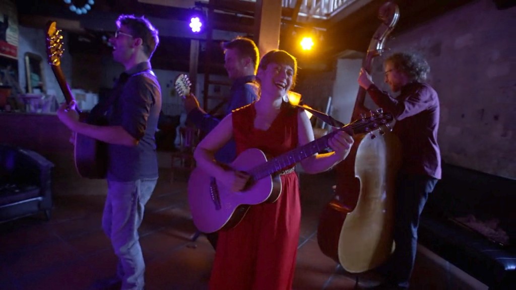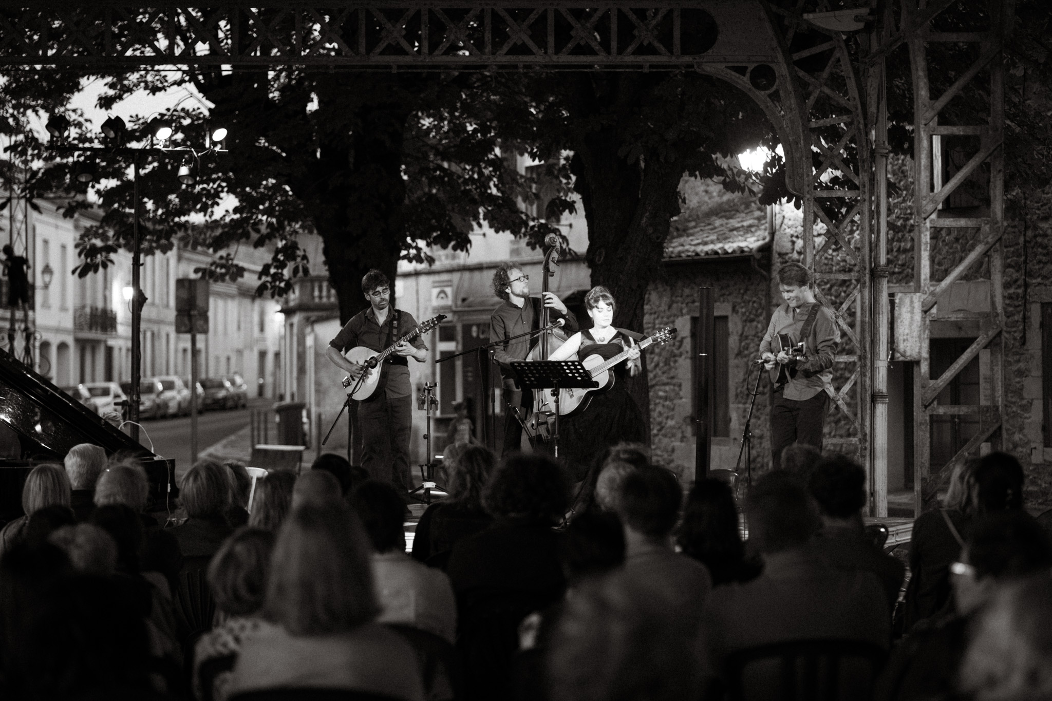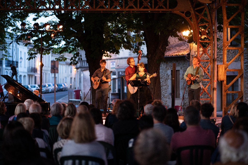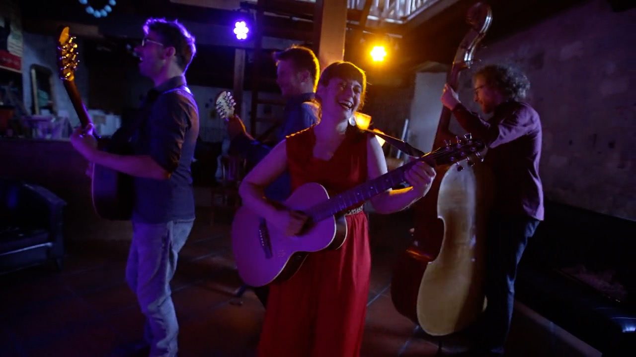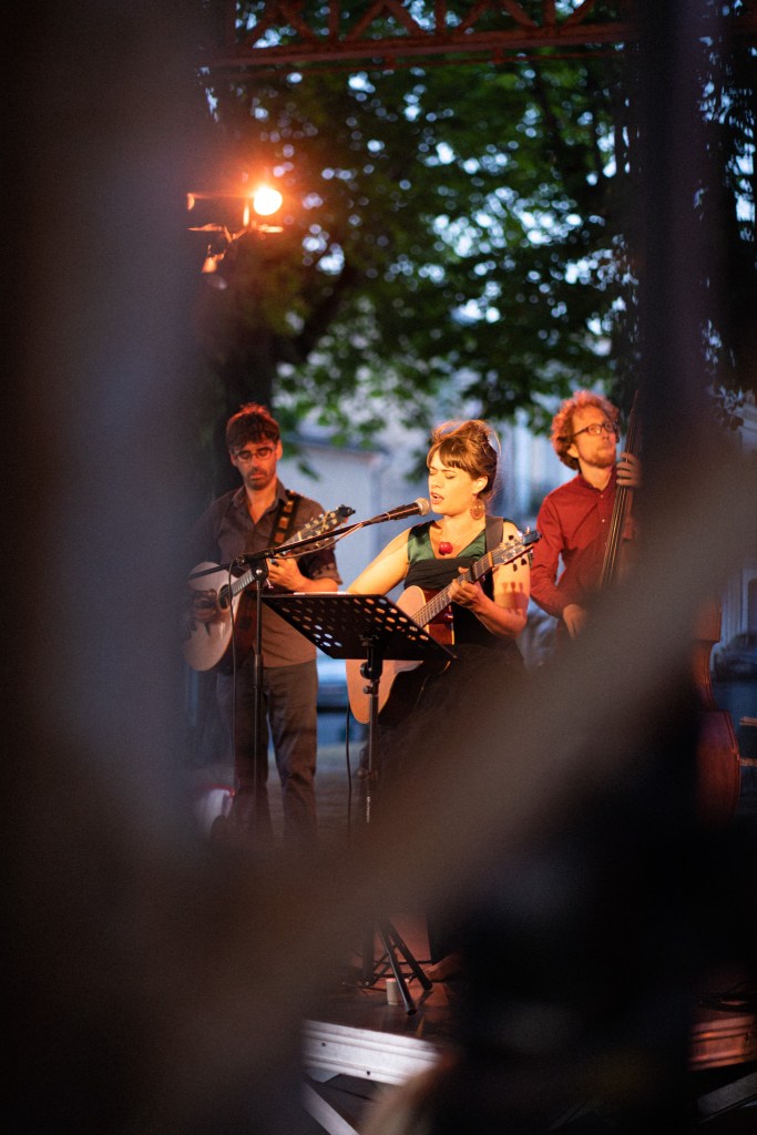 Julie Mathevet vient du lyrique, et sa voix riche et grave rappelle la noirceur chaude du fado. En soutien à sa guitare folk, vient la contrebasse aux sonorités jazz de Guillaume Vallot. Camille Raibaud à la mandoline, puise l’inspiration de ses mélismes dans son jeu de violoniste traditionnel occitan. Julien Estèves au bouzouki, nourri de blues et de rythmes africains, ajoute une densité au groupe, alternant entre rythmique et chorus.