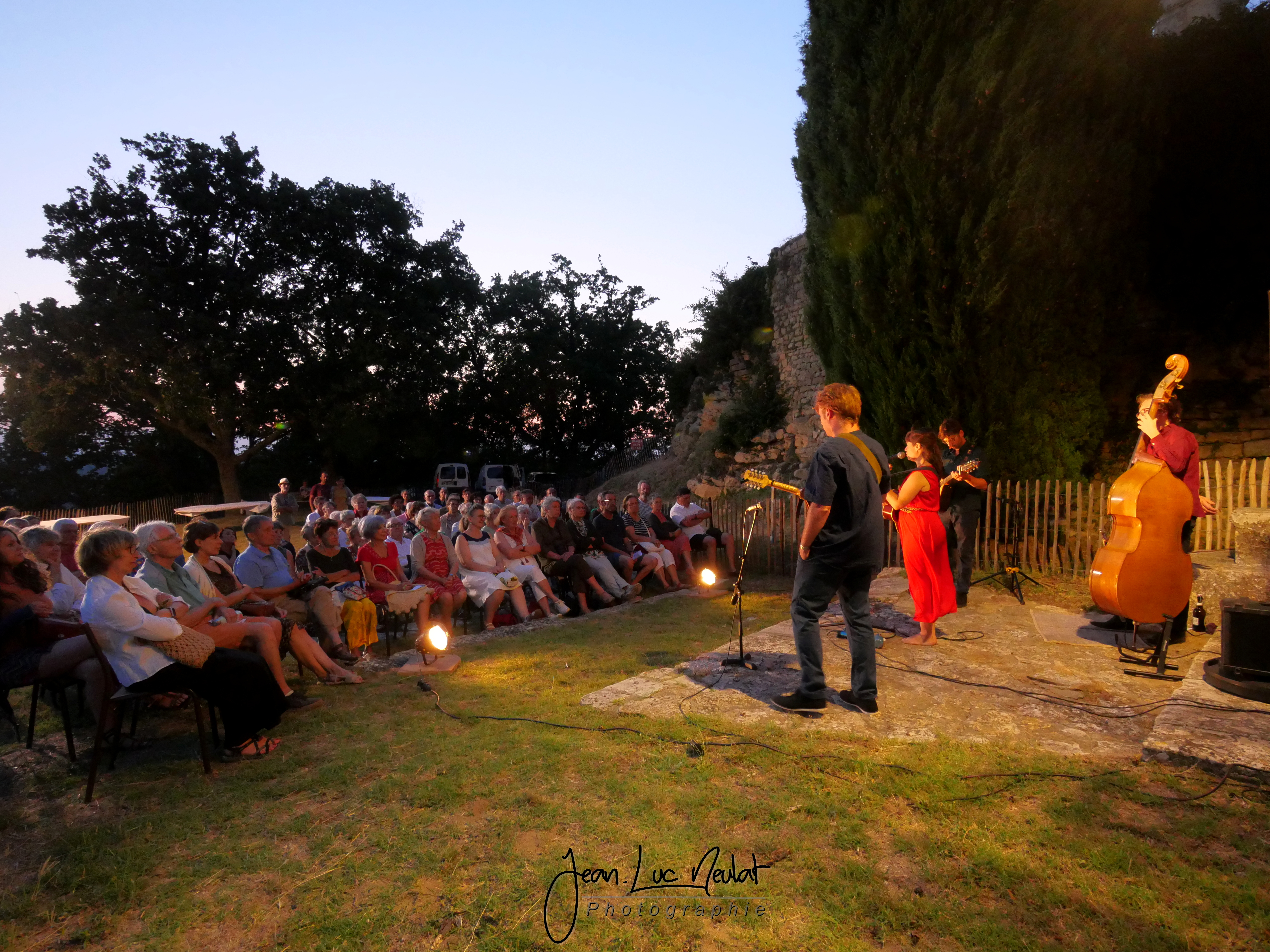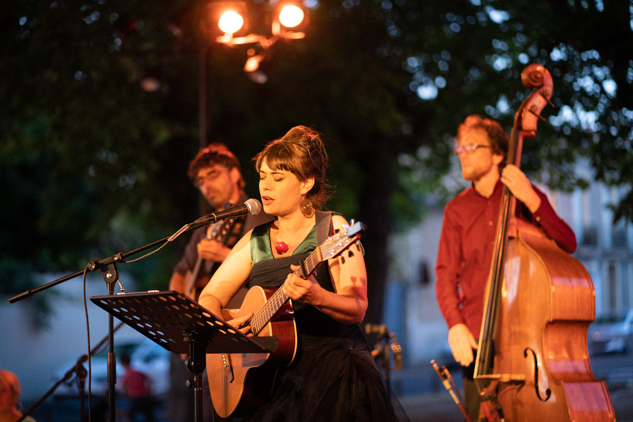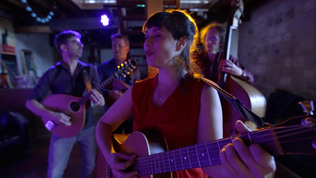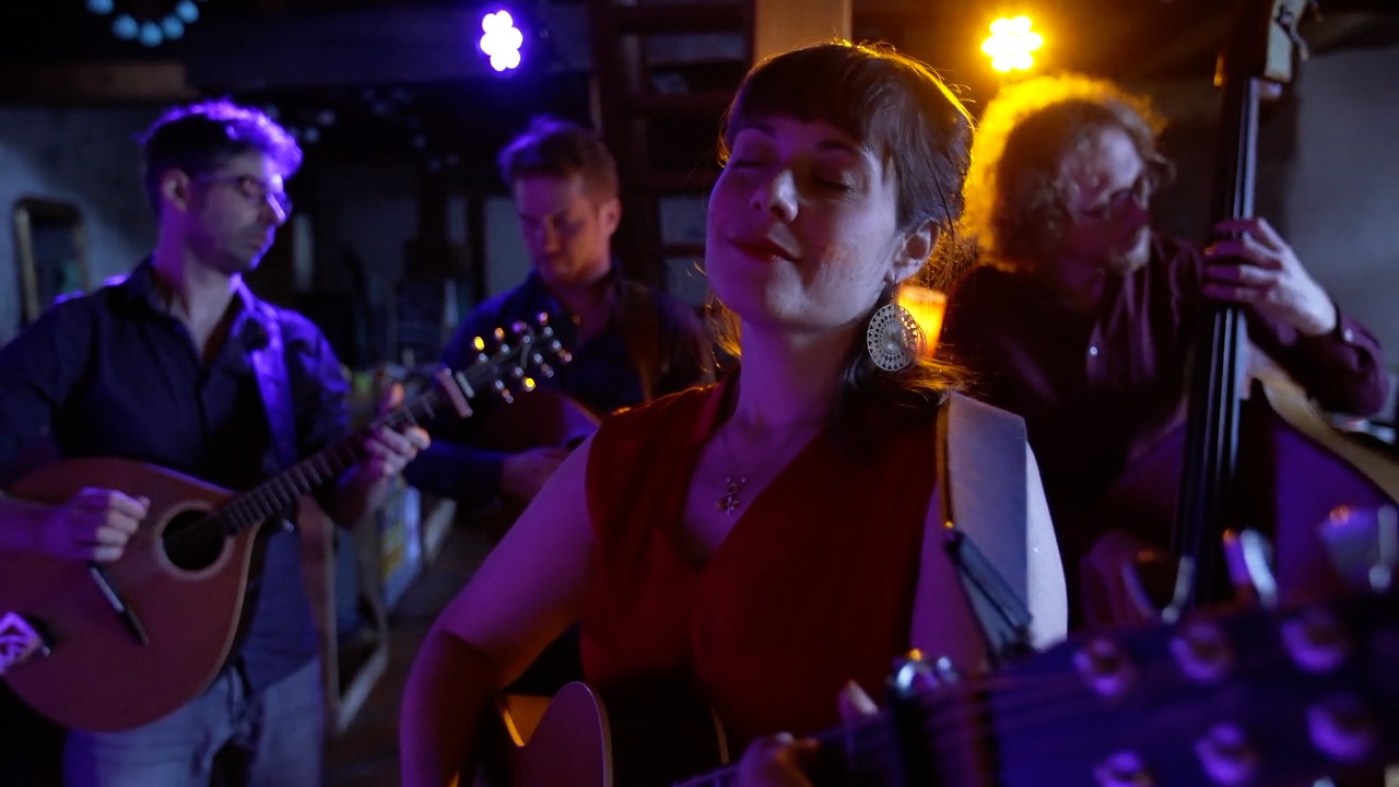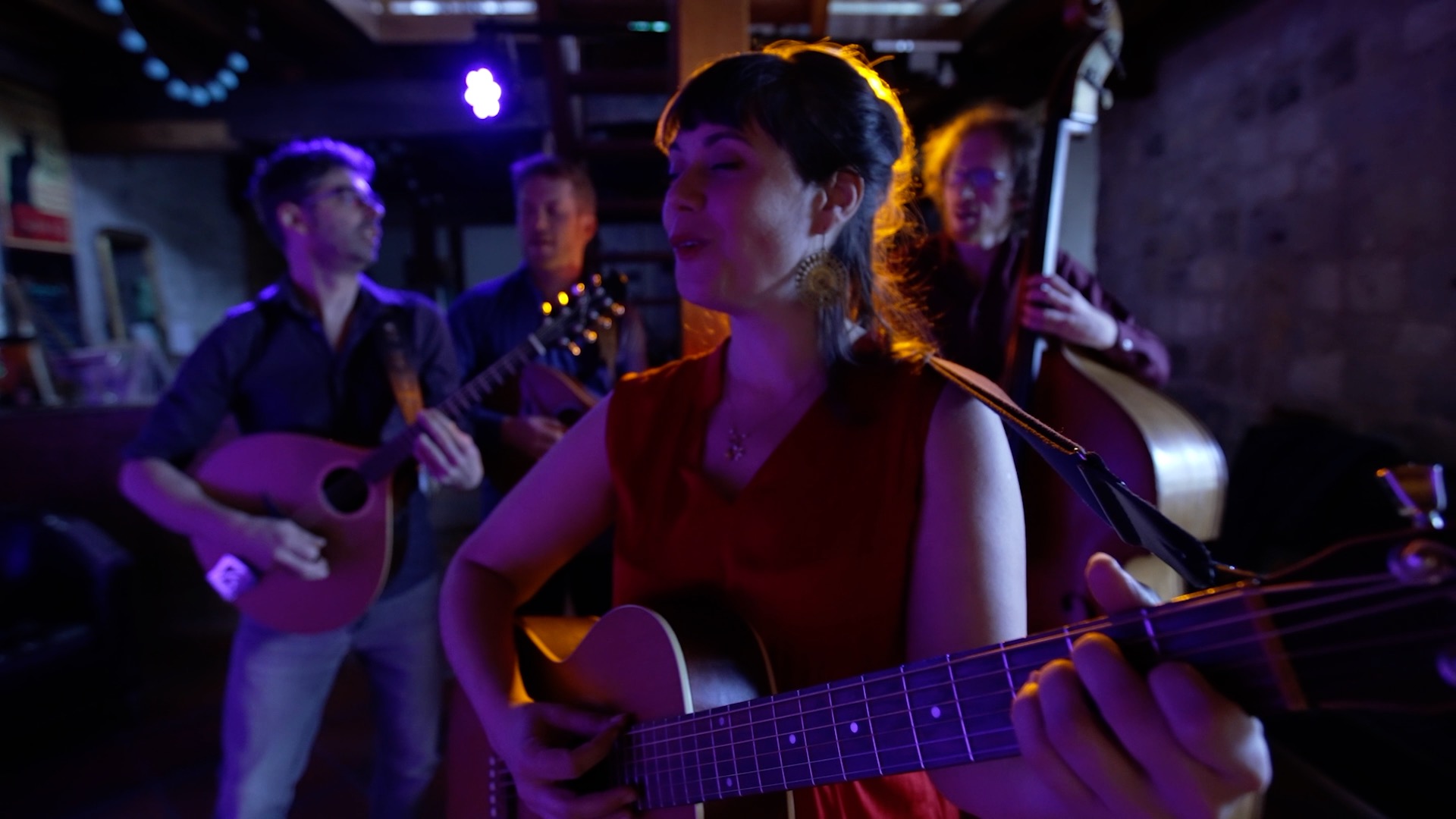 Julie Mathevet vient du lyrique, et sa voix riche et grave rappelle la noirceur chaude du fado. En soutien à sa guitare folk, vient la contrebasse aux sonorités jazz de Guillaume Vallot. Camille Raibaud à la mandoline, puise l’inspiration de ses mélismes dans son jeu de violoniste traditionnel occitan. Julien Estèves au bouzouki, nourri de blues et de rythmes africains, ajoute une densité au groupe, alternant entre rythmique et chorus.